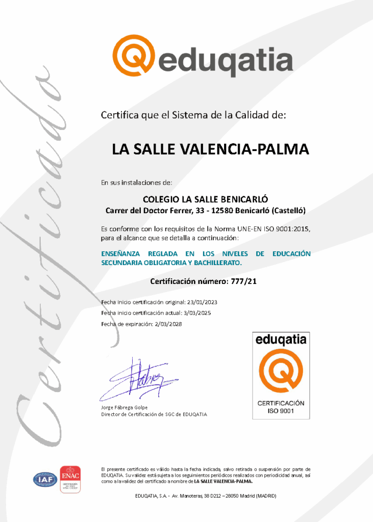 En La Salle Benicarló, apostamos firmemente por la excelencia en la gestión. Por ello, como todos los centros La Salle, nos regimos por un sistema de gestión de calidad Multisite, certificado bajo la norma ISO 9001:2015.